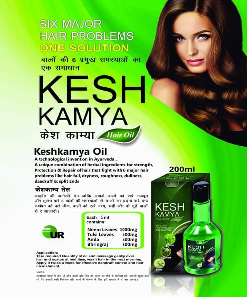 KESH KAMYA HAIR OIL – The technological invention in Ayurveda is a different combination of herbal ingredients for power, protection & repair of hair that fights 6 main hair problems. KESH KAMYA HAIR OIL has Neem Leaves, Tulsi Leaves, Amla, and Bhringraj. All ingredients together make your hair stronger and shinier. It is a popular Ayurvedic hair oil that saves you from scalp itching, and dryness and stops fungal infection of the scalp. Moreover, protects from premature greying of hair increases hair growth, and strengthens hair roots. If you are searching for an oil that can solve all hair problems then must try KESH KAMYA HAIR OIL. Protection and Repair of Hair that fights 6 hair major issues Hair Fall, Dullness, Dandruff, Dryness, Roughness, and Split Ends.